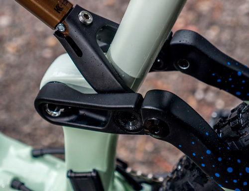 Рулевой стакан наклоняется на 66 градусов и принимает на себя нагрузку от вилки Fox 34 с ходом в 140 мм, подседельная труба в это время наклонена на 77 градусов.