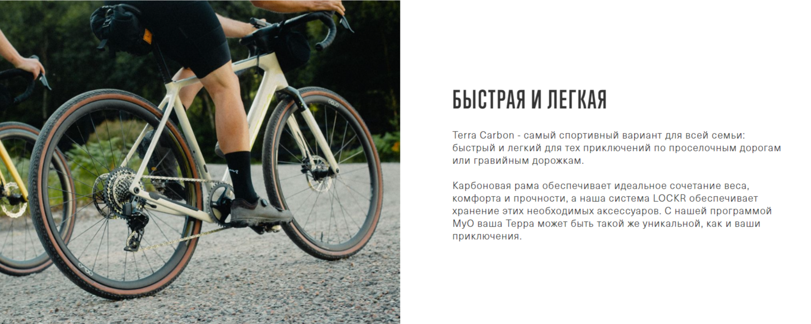 Продуманная интеграция и функции адаптируются к вашим потребностям, а чрезвычайно удобная для езды по гравию геометрия обеспечивает комфорт и точность независимо от того, куда вы направляетесь. Определение езды по гравию может меняться в зависимости от города, региона или страны, но Terra адаптируется и готова к использованию.