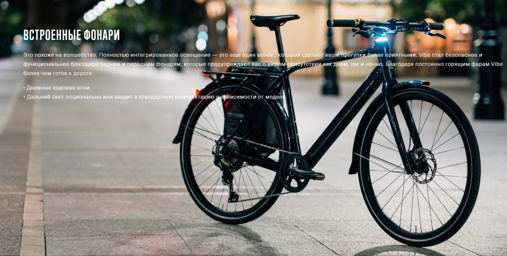 Наша концепция «Достаточно энергии» произведет революцию в способах езды на велосипеде. Vibe — это новый тип электрического велосипеда: минималистичный, интегрированный и элегантный. В нем отсутствуют громоздкие компоненты, чтобы улучшить впечатления от езды, и создается впечатление, что вы можете иметь больше «велосипеда» с меньшим «электричеством».