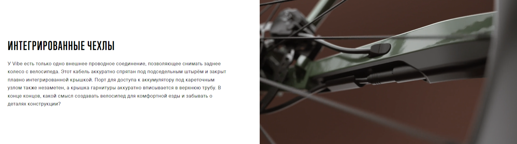 Разработка нового лёгкого кареточного узла рамы для Vibe позволила нам значительно повысить жёсткость, упростить доступ к аккумулятору и освободить больше места для прокладки внутренних кабелей, а также увеличить пространство для шин и брызговиков.