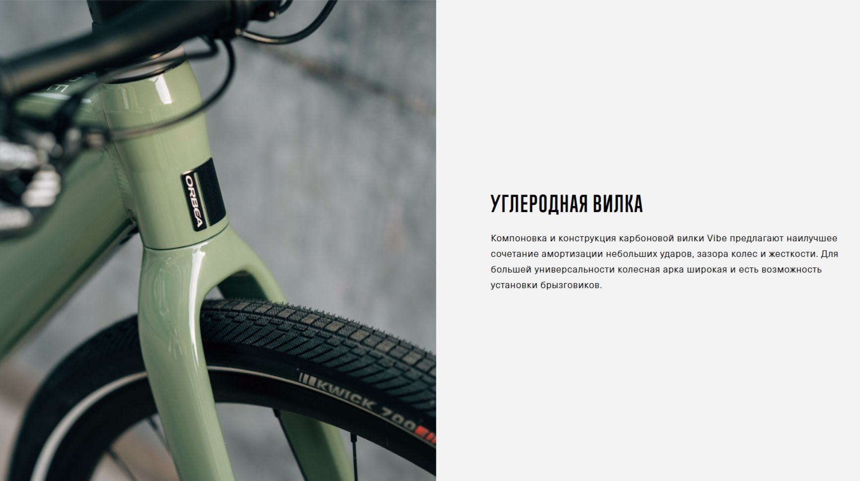| Вилка | Карбоновая вилка Orbea Vibe, полностью карбоновая, 1-1/5, максимальная ширина шины 700x45, плоское крепление диска, ось Thrue 12x100 мм |