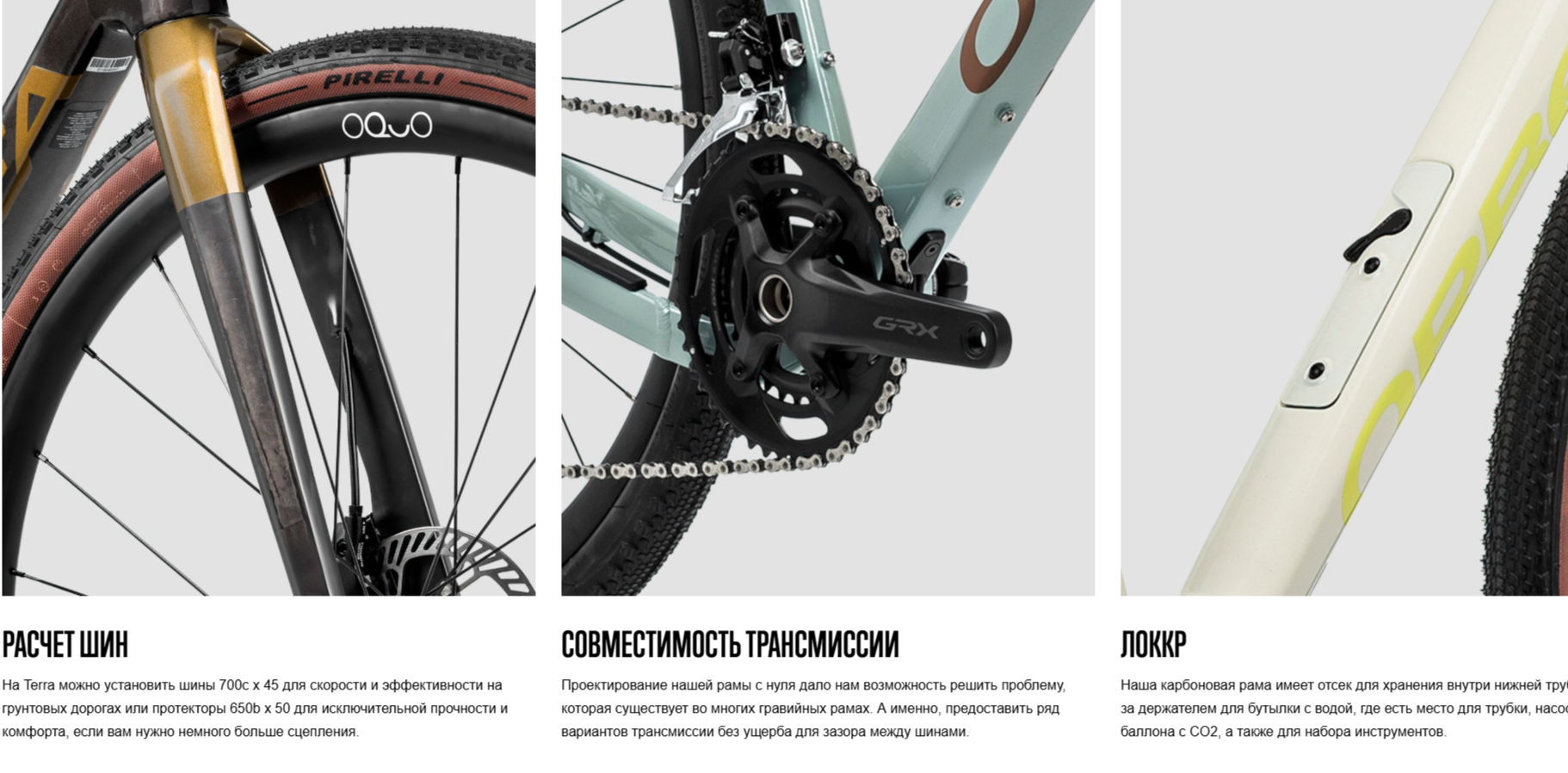 | Рама | Orbea Terra carbon OMR Disc, monocoque construction, HS 1,5", PF30, powermeter compatible, Thru Axle 12x142mm rear, thread M12x2 P1, Internal Cable Routing, LOCKR service box |
